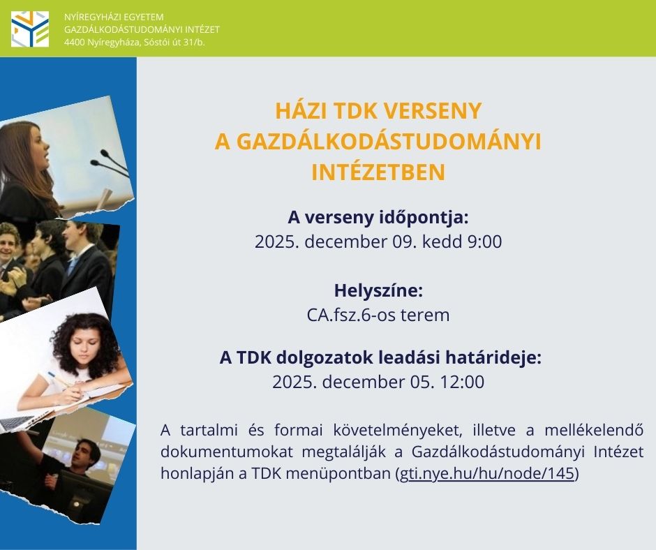 Versenyfelhívás 2025/2026. I. félévVersenyfelhívás 2024/2025. II. félévVersenyfelhívás 2024/2025. I. félévVersenyfelhívás 2023/2024. II. félévÁltalános információkTDK dokumentumokA TDK dolgozat tartalmi és formai követelményeiHallgatói nyilatkozatKonzulensi nyilatkozatÁtvételi elismervényHázi TDK versenyArchívum