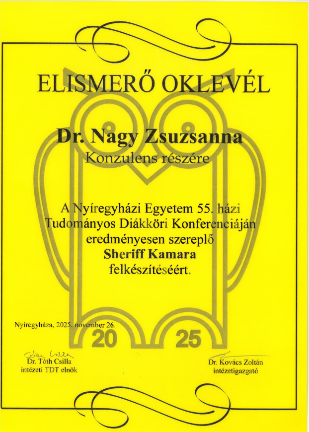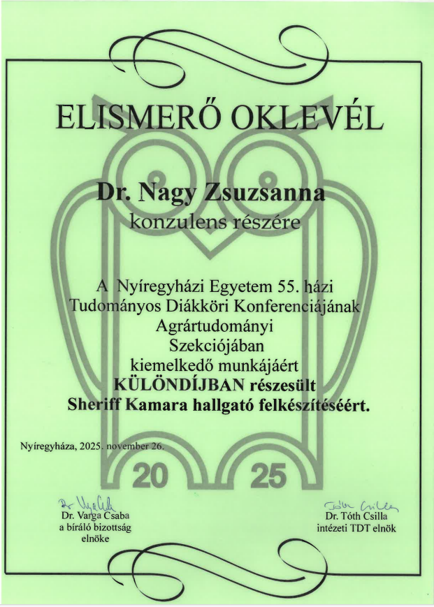 Az Agrártudományi Szekcióban kolléganőnk, Dr. Nagy Zsuzsanna főiskolai docens felkészítésével, szerepelt Sheriff Kamara, és dolgozatáért Különdíjban részesült.